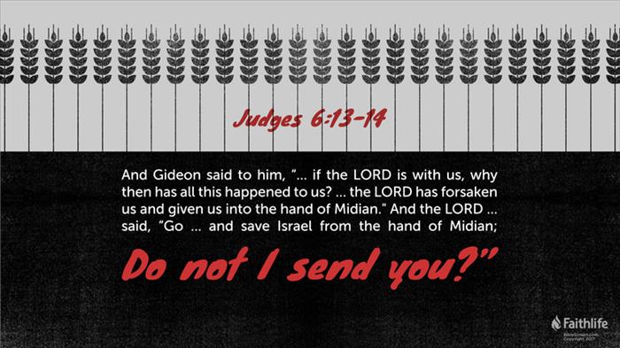 11 Now the angel of the Lord came and sat under the terebinth at Ophrah, which belonged to Joash vthe Abiezrite, while his son wGideon was beating out wheat in the winepress to hide it from the Midianites. 12 And xthe angel of the Lord appeared to him and said to him, y“The Lord is with you, O mighty man of valor.” 13 And Gideon said to him, “Please, my lord, if the Lord is with us, why then has all this happened to us? And where are zall his wonderful deeds athat our fathers recounted to us, saying, ‘Did not the Lord bring us up from Egypt?’ But now the Lord has forsaken us and given us into the hand of Midian.” 14 And the Lord1 turned to him and said, “Go in this might of yours and save Israel from the hand of Midian; bdo not I send you?” 15 And he said to him, c“Please, Lord, how can I save Israel? Behold, dmy clan is the weakest in Manasseh, and I am the least in my father’s house.” 16 And the Lord said to him, e“But I will be with you, and you shall strike the Midianites as one man.” 17 And he said to him, f“If now I have found favor in your eyes, then gshow me a sign that it is you who speak with me. 18 Please hdo not depart from here until I come to you and bring out my present and set it before you.” And he said, “I will stay till you return.”