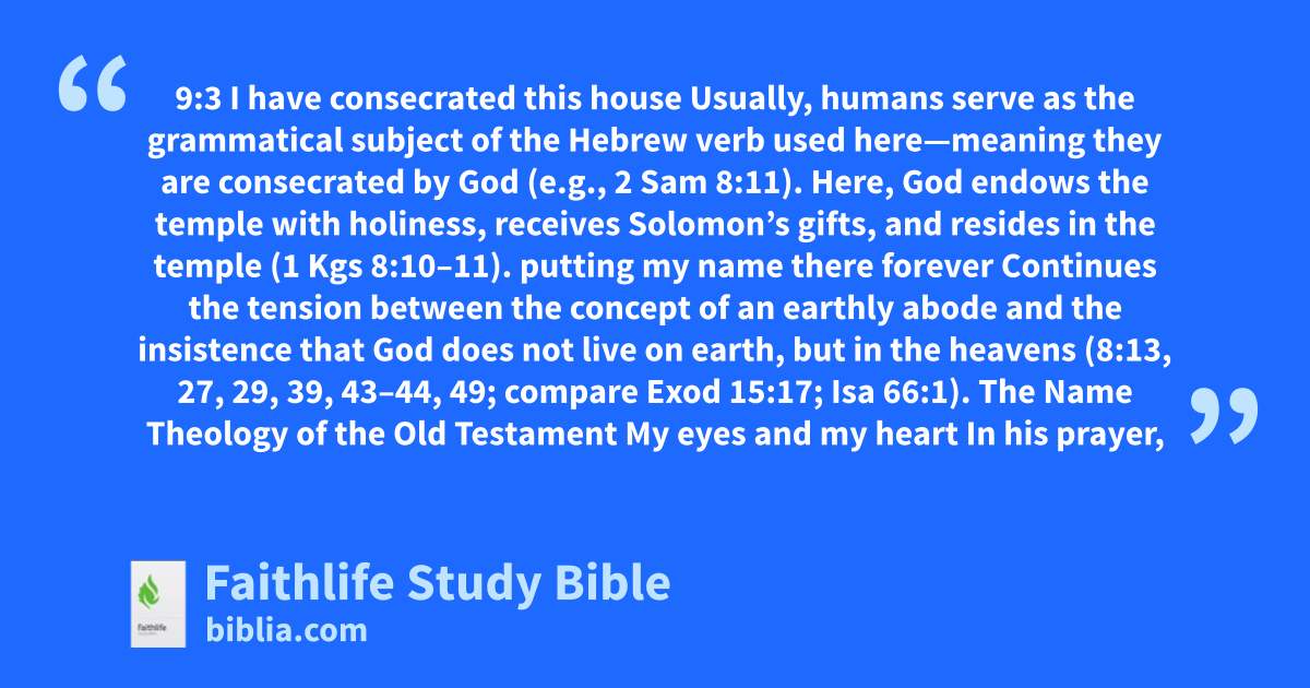 9:3 I have consecrated this house Usually, humans serve as the grammatical subject of the Hebrew verb used here—meaning they are consecrated by God (e.g., 2 Sam 8:11). Here, God endows the temple with holiness, receives Solomon’s gifts, and resides in the temple (1 Kgs 8:10–11).