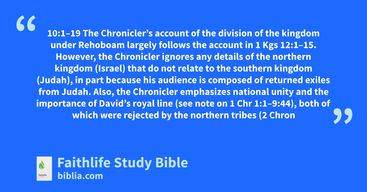 10:1–19 The Chronicler’s account of the division of the kingdom under Rehoboam largely follows the account in 1 Kgs 12:1–15. However, the Chronicler ignores any details of the northern kingdom (Israel) that do not relate to the southern kingdom (Judah), in part because his audience is composed of returned exiles from Judah. Also, the Chronicler emphasizes national unity and the importance of David’s royal line (see note on 1 Chr 1:1–9:44), both of which were rejected by the northern tribes (2 Chron 10:16, 19).
