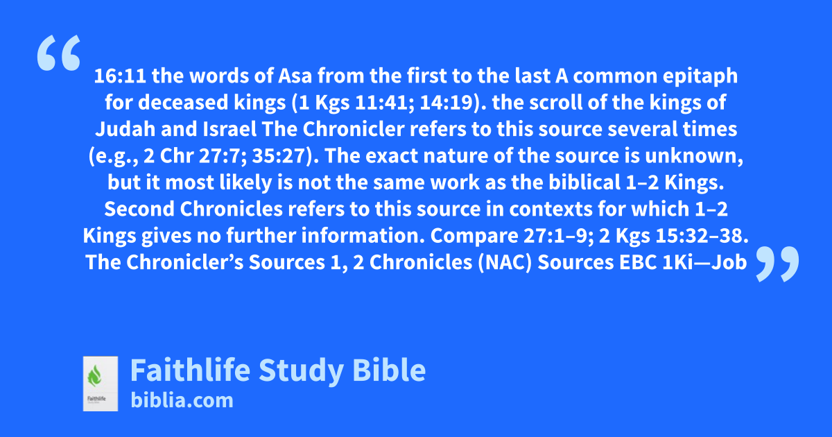 16:11 the words of Asa from the first to the last A common epitaph for deceased kings (1 Kgs 11:41; 14:19).