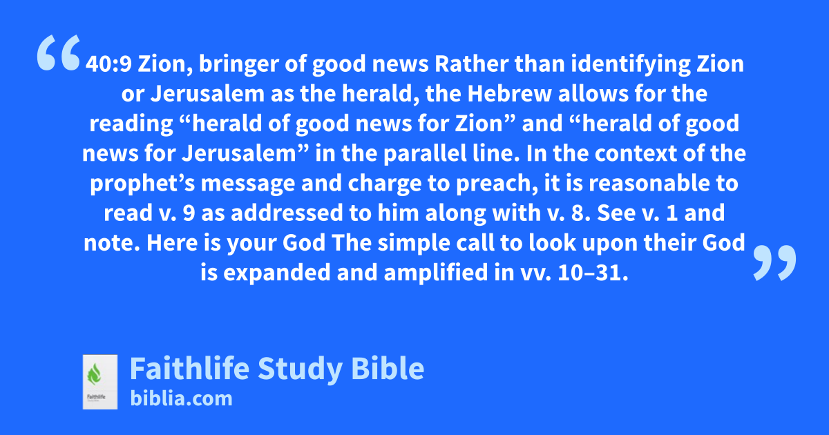 40:9 Zion, bringer of good news Rather than identifying Zion or Jerusalem as the herald, the Hebrew allows for the reading “herald of good news for Zion” and “herald of good news for Jerusalem” in the parallel line. In the context of the prophet’s message and charge to preach, it is reasonable to read v. 9 as addressed to him along with v. 8. See v. 1 and note.