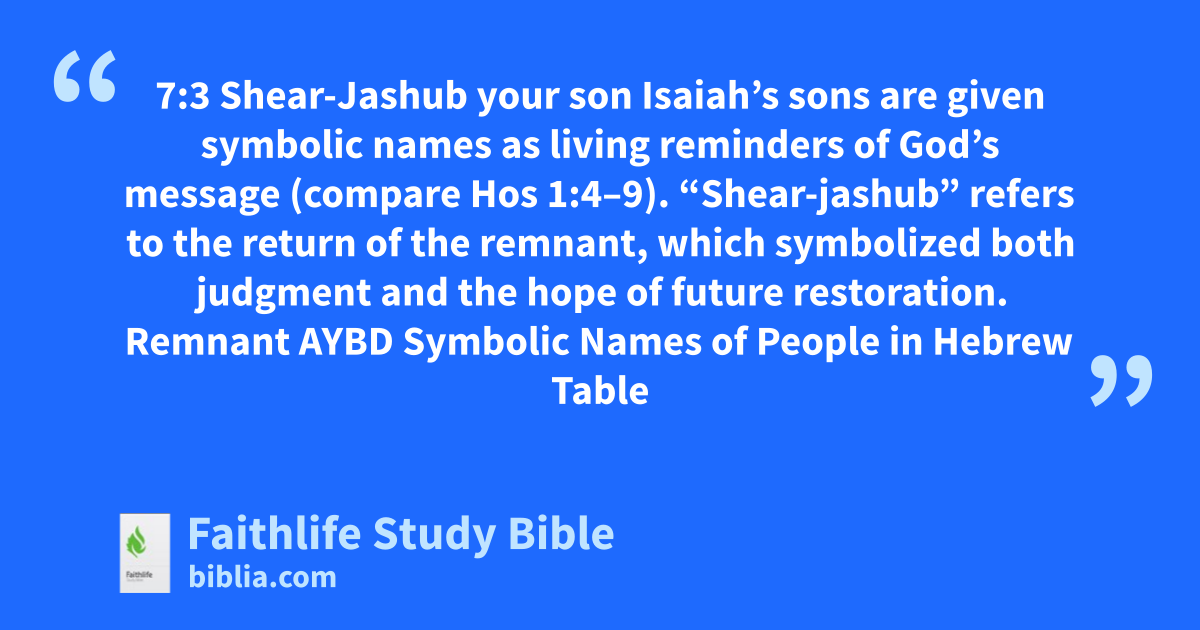 7:3 Shear-Jashub your son Isaiah’s sons are given symbolic names as living reminders of God’s message (compare Hos 1:4–9). “Shear-jashub” refers to the return of the remnant, which symbolized both judgment and the hope of future restoration.