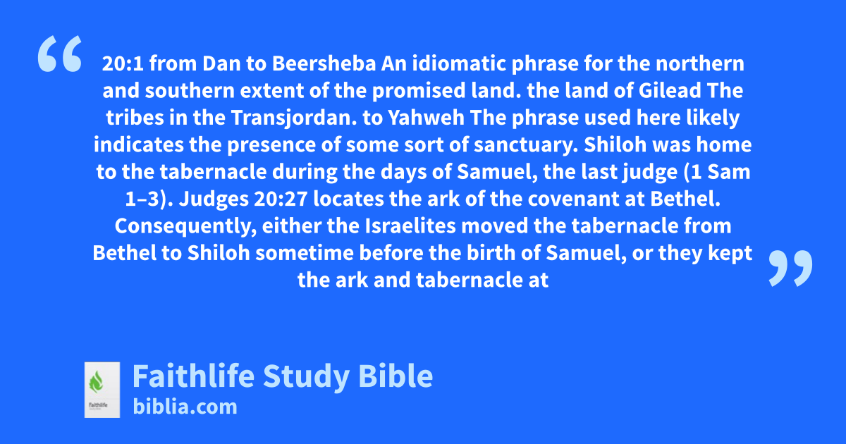 20:1 from Dan to Beersheba An idiomatic phrase for the northern and southern extent of the promised land.