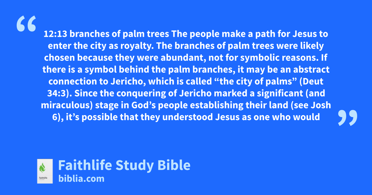 12:13 branches of palm trees The people make a path for Jesus to enter the city as royalty.