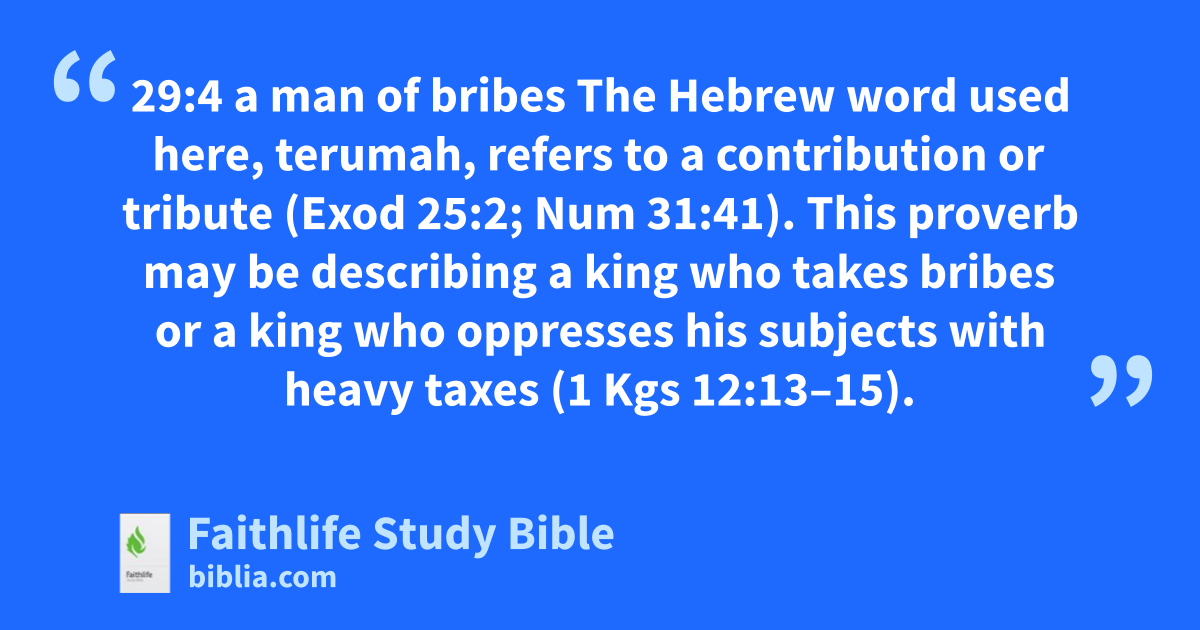 29:4 a man of bribes The Hebrew word used here, terumah, refers to a contribution or tribute (Exod 25:2; Num 31:41). This proverb may be describing a king who takes bribes or a king who oppresses his subjects with heavy taxes (1 Kgs 12:13–15).
