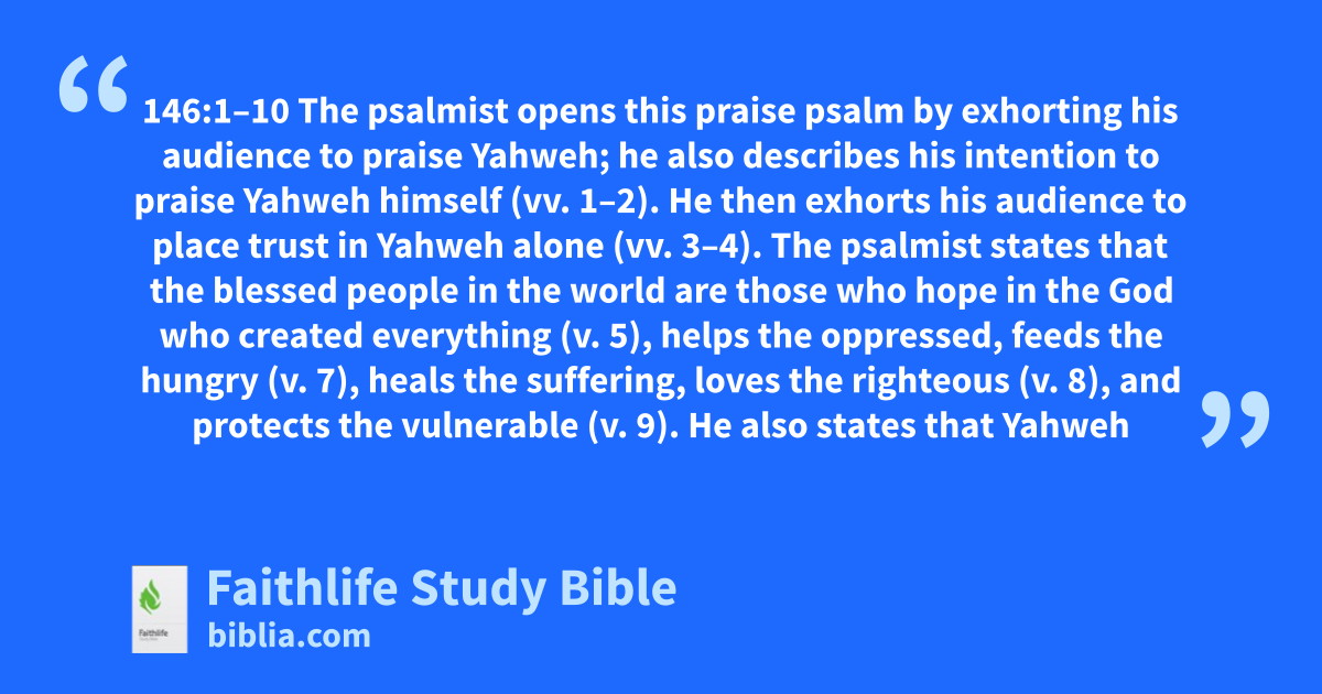 146:3–4 The psalmist exhorts his audience to avoid trusting powerful human rulers, implying that Yahweh is the only one worthy of being trusted. |