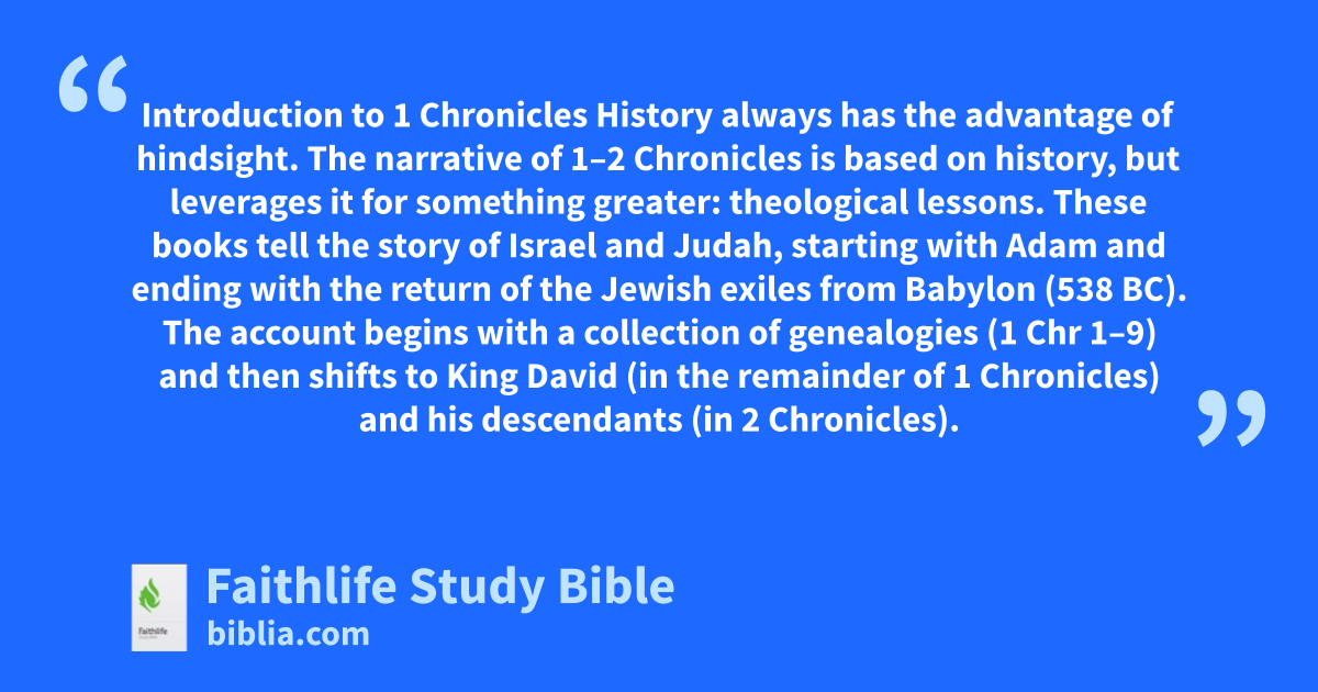 History always has the advantage of hindsight. The narrative of 1–2 Chronicles is based on history, but leverages it for something greater: theological lessons. These books tell the story of Israel and Judah, starting with Adam and ending with the return of the Jewish exiles from Babylon (538 bc). The account begins with a collection of genealogies (1 Chr 1–9) and then shifts to King David (in the remainder of 1 Chronicles) and his descendants (in 2 Chronicles).