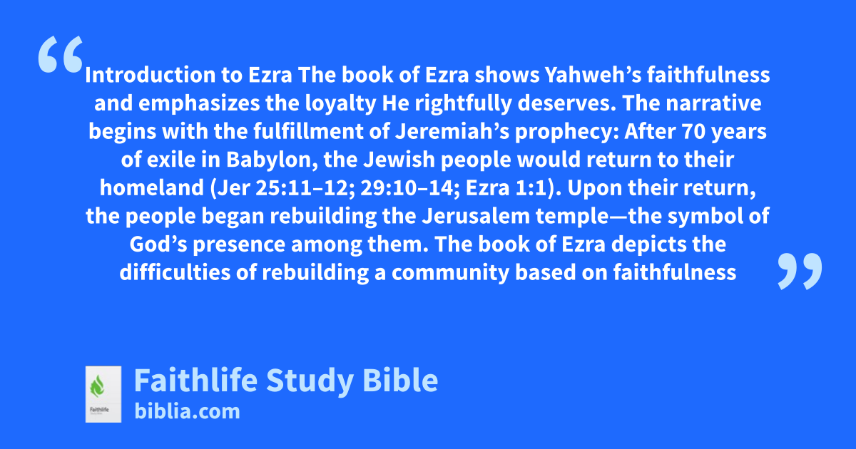 The book of Ezra shows Yahweh’s faithfulness and emphasizes the loyalty He rightfully deserves. The narrative begins with the fulfillment of Jeremiah’s prophecy: After 70 years of exile in Babylon, the Jewish people would return to their homeland (Jer 25:11–12; 29:10–14; Ezra 1:1). Upon their return, the people began rebuilding the Jerusalem temple—the symbol of God’s presence among them. The book of Ezra depicts the difficulties of rebuilding a community based on faithfulness to Yahweh.