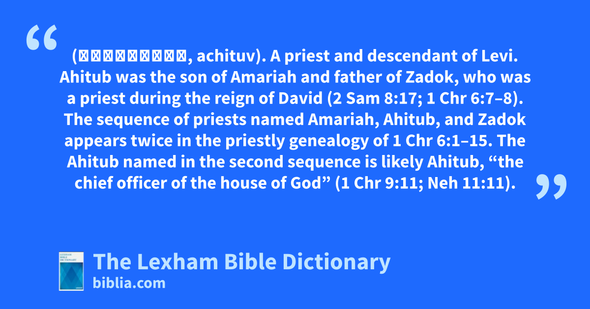 Ahitub, Son of Amariah (אֲחִיטוּב, achituv). A priest and descendant of Levi. Ahitub was the son of Amariah and father of Zadok, who was a priest during the reign of David (2 Sam 8:17; 1 Chr 6:7–8). The sequence of priests named Amariah, Ahitub, and Zadok appears twice in the priestly genealogy of 1 Chr 6:1–15. The Ahitub named in the second sequence is likely Ahitub, “the chief officer of the house of God” (1 Chr 9:11; Neh 11:11).