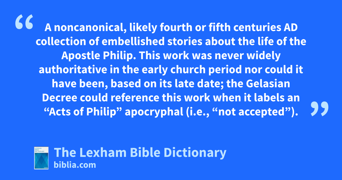 Acts of Philip A noncanonical, likely fourth or fifth centuries ad collection of embellished stories about the life of the Apostle Philip. This work was never widely authoritative in the early church period nor could it have been, based on its late date; the Gelasian Decree could reference this work when it labels an “Acts of Philip” apocryphal (i.e., “not accepted”).