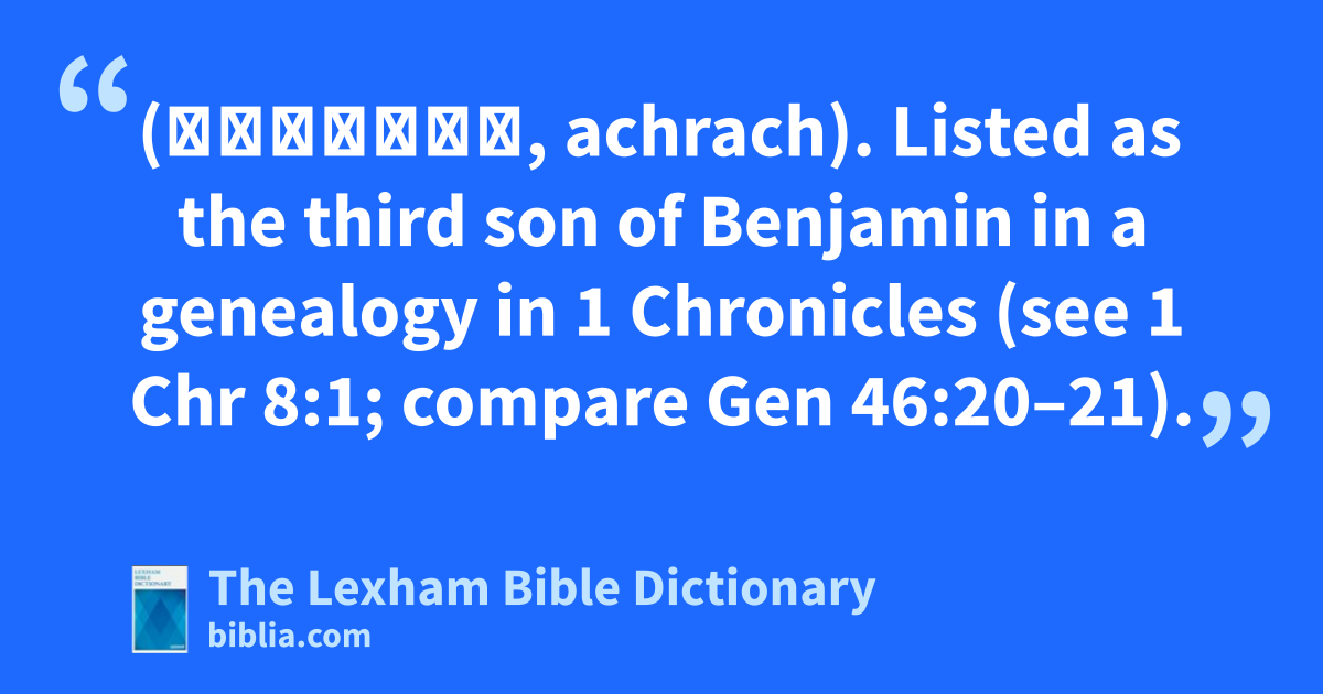 Aharah, Son of Benjamin (אַחְרַח, achrach). Listed as the third son of Benjamin in a genealogy in 1 Chronicles (see 1 Chr 8:1; compare Gen 46:20–21).
