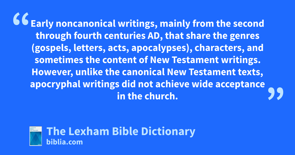 Apocrypha, New Testament Early noncanonical writings, mainly from the second through fourth centuries ad, that share the genres (gospels, letters, acts, apocalypses), characters, and sometimes the content of New Testament writings. However, unlike the canonical New Testament texts, apocryphal writings did not achieve wide acceptance in the church.
