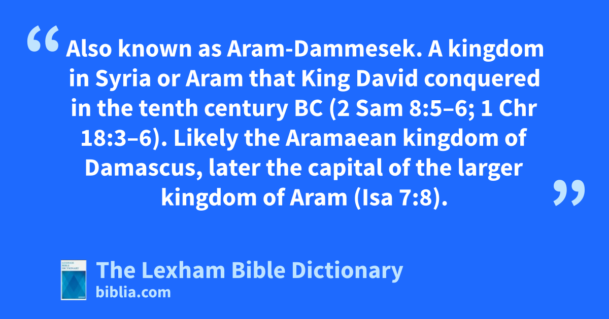 Aram of Damascus Also known as Aram-Dammesek. A kingdom in Syria or Aram that King David conquered in the tenth century bc (2 Sam 8:5–6; 1 Chr 18:3–6). Likely the Aramaean kingdom of Damascus, later the capital of the larger kingdom of Aram (Isa 7:8).