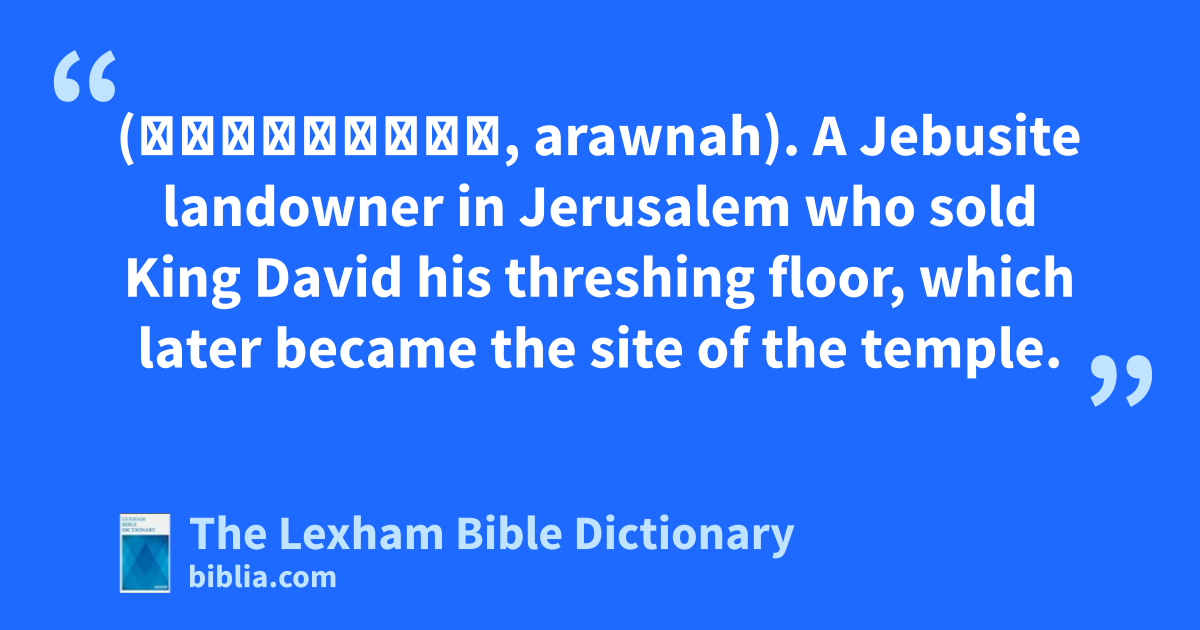 Araunah (אֲרַוְנָה, arawnah). A Jebusite landowner in Jerusalem who sold King David his threshing floor, which later became the site of the temple.