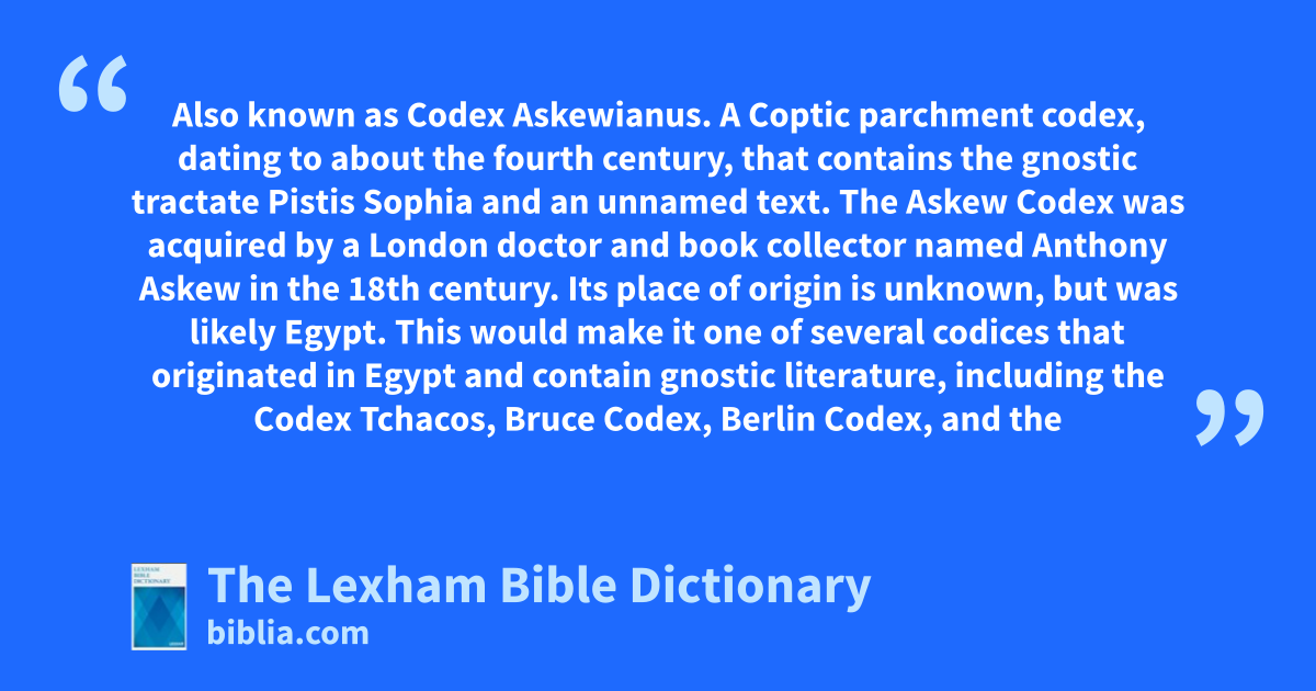 Askew Codex Also known as Codex Askewianus. A Coptic parchment codex, dating to about the fourth century, that contains the gnostic tractate Pistis Sophia and an unnamed text.