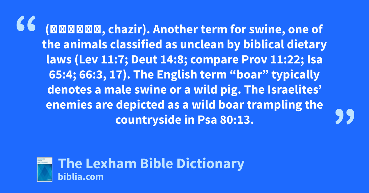 Boar (חֲזִיר, chazir). Another term for swine, one of the animals classified as unclean by biblical dietary laws (Lev 11:7; Deut 14:8; compare Prov 11:22; Isa 65:4; 66:3, 17). The English term “boar” typically denotes a male swine or a wild pig. The Israelites’ enemies are depicted as a wild boar trampling the countryside in Psa 80:13.