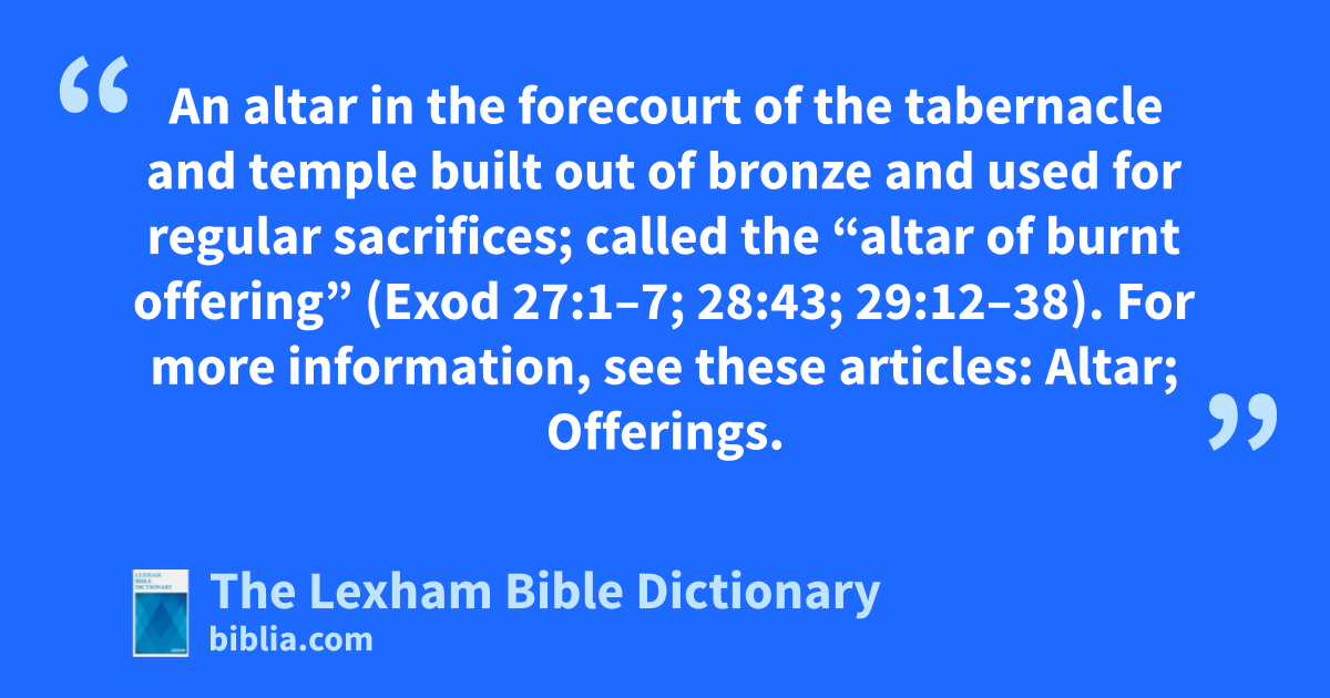 Bronze Altar An altar in the forecourt of the tabernacle and temple built out of bronze and used for regular sacrifices; called the “altar of burnt offering” (Exod 27:1–7; 28:43; 29:12–38). For more information, see these articles: Altar; Offerings.