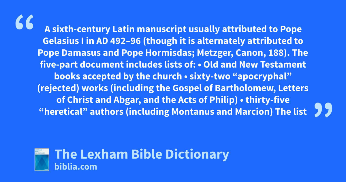 Decretum Gelasianum A sixth-century Latin manuscript usually attributed to Pope Gelasius I in ad 492–96 (though it is alternately attributed to Pope Damasus and Pope Hormisdas; Metzger, Canon, 188). The five-part document includes lists of: