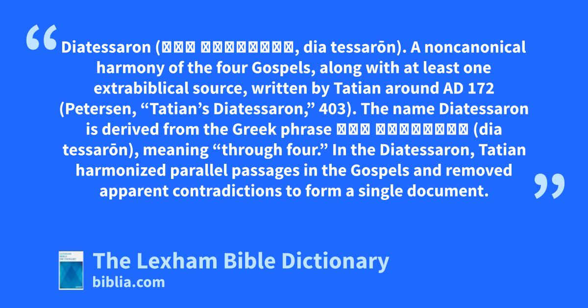 Diatessaron Diatessaron (διὰ τεσσάρων, dia tessarōn). A noncanonical harmony of the four Gospels, along with at least one extrabiblical source, written by Tatian around ad 172 (Petersen, “Tatian’s Diatessaron,” 403). The name Diatessaron is derived from the Greek phrase διὰ τεσσάρων (dia tessarōn), meaning “through four.” In the Diatessaron, Tatian harmonized parallel passages in the Gospels and removed apparent contradictions to form a single document.