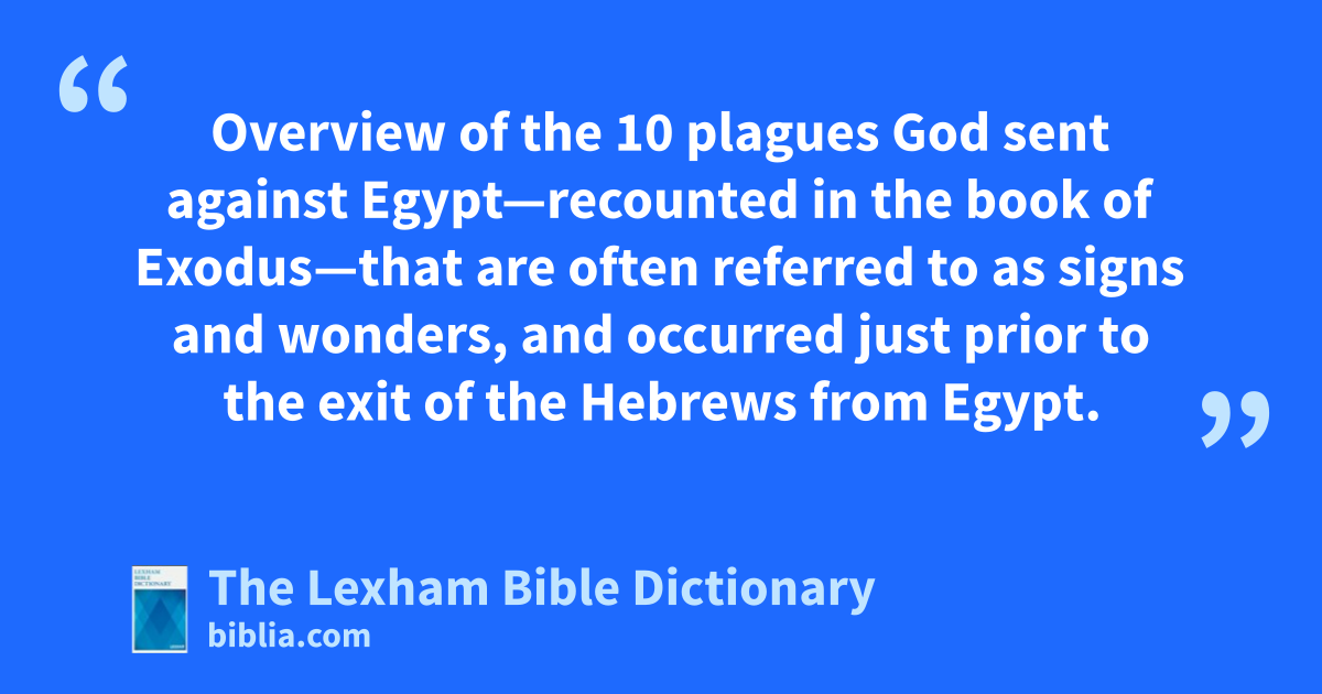 Egypt, Plagues Of Overview of the 10 plagues God sent against Egypt—recounted in the book of Exodus—that are often referred to as signs and wonders, and occurred just prior to the exit of the Hebrews from Egypt.