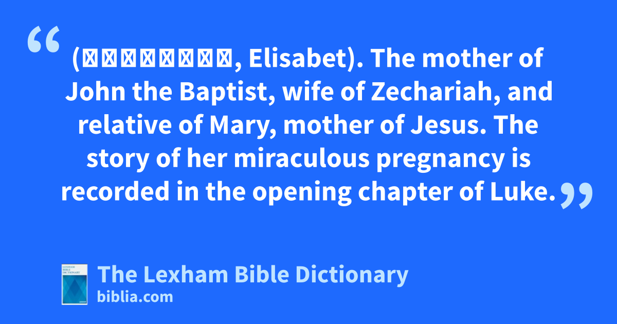 Elizabeth, Mother of John the Baptist (Ἐλισάβετ, Elisabet). The mother of John the Baptist, wife of Zechariah, and relative of Mary, mother of Jesus. The story of her miraculous pregnancy is recorded in the opening chapter of Luke.