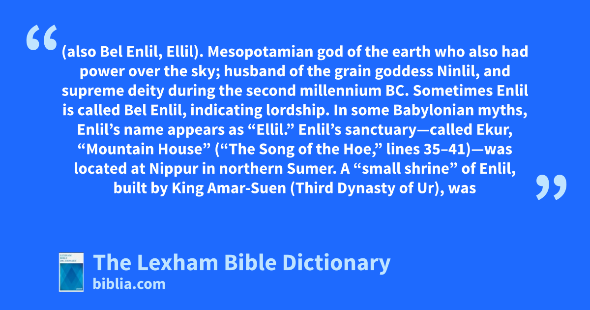 Enlil (also Bel Enlil, Ellil). Mesopotamian god of the earth who also had power over the sky; husband of the grain goddess Ninlil, and supreme deity during the second millennium bc. Sometimes Enlil is called Bel Enlil, indicating lordship. In some Babylonian myths, Enlil’s name appears as “Ellil.”