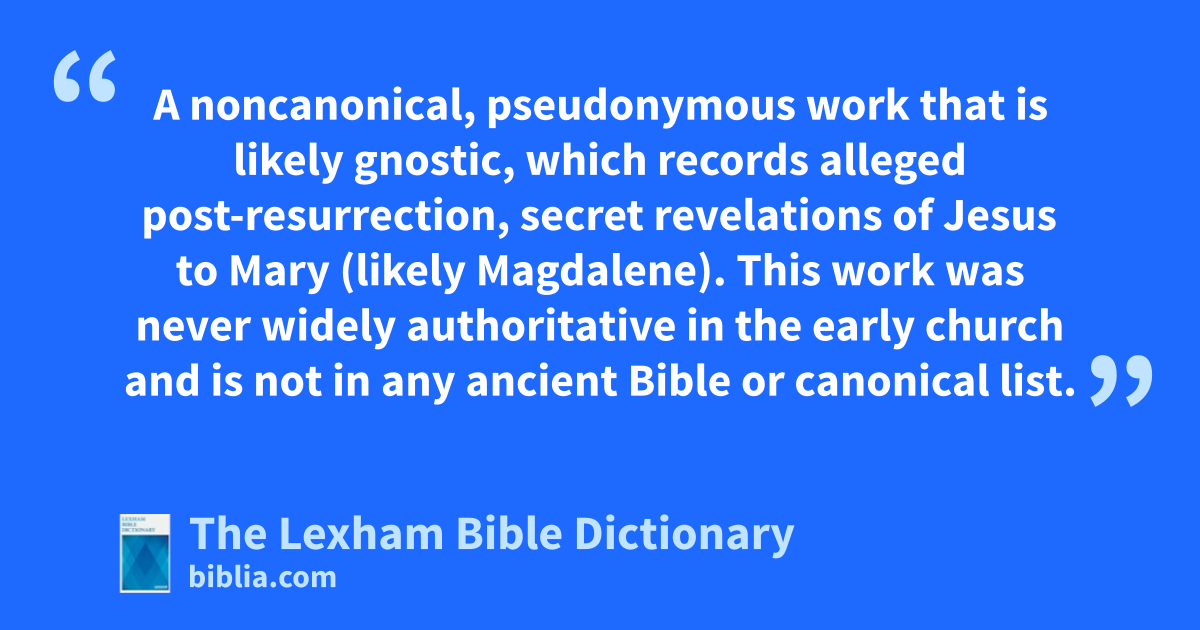 Gospel of Mary A noncanonical, pseudonymous work that is likely gnostic, which records alleged post-resurrection, secret revelations of Jesus to Mary (likely Magdalene). This work was never widely authoritative in the early church and is not in any ancient Bible or canonical list.
