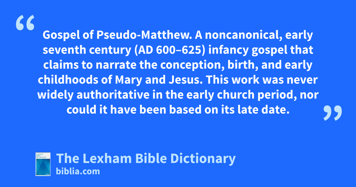 Gospel of Pseudo-Matthew Gospel of Pseudo-Matthew. A noncanonical, early seventh century (ad 600–625) infancy gospel that claims to narrate the conception, birth, and early childhoods of Mary and Jesus. This work was never widely authoritative in the early church period, nor could it have been based on its late date.