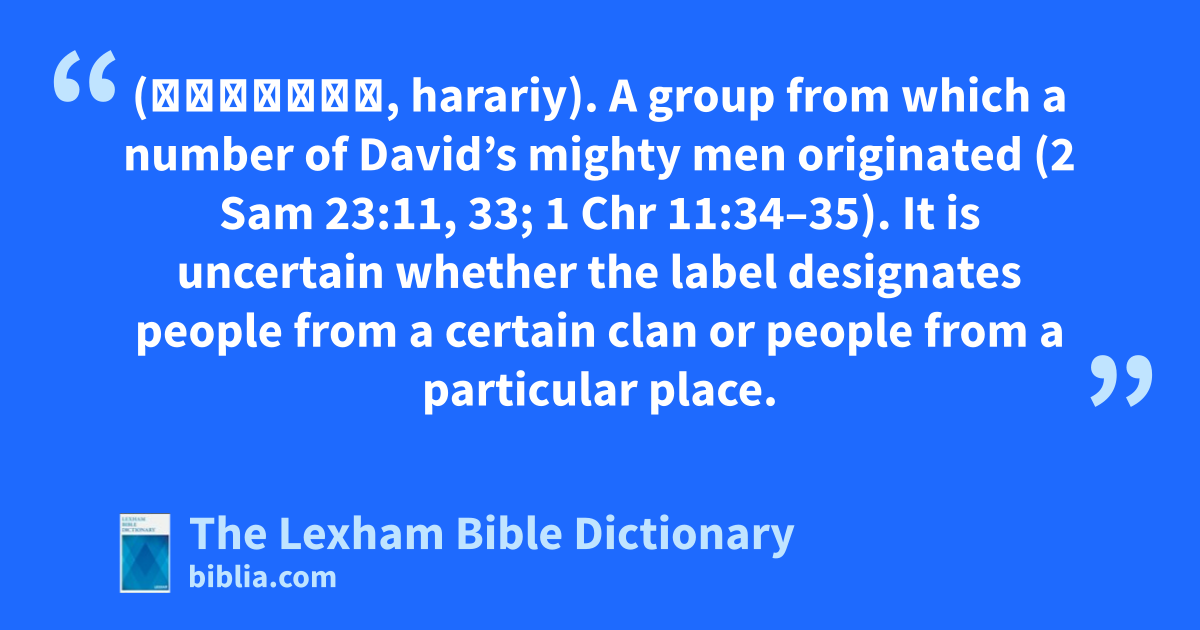 Hararites (הֲרָרִי, harariy). A group from which a number of David’s mighty men originated (2 Sam 23:11, 33; 1 Chr 11:34–35). It is uncertain whether the label designates people from a certain clan or people from a particular place.