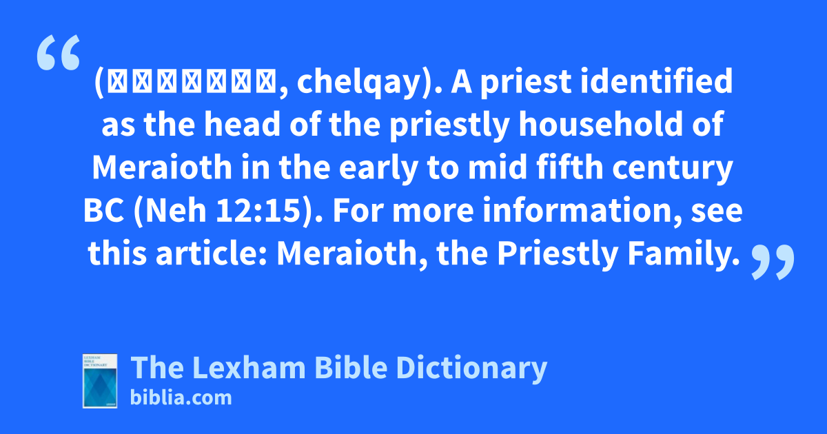 Helkai (חֶלְקָי, chelqay). A priest identified as the head of the priestly household of Meraioth in the early to mid fifth century BC (Neh 12:15). For more information, see this article: Meraioth, the Priestly Family.