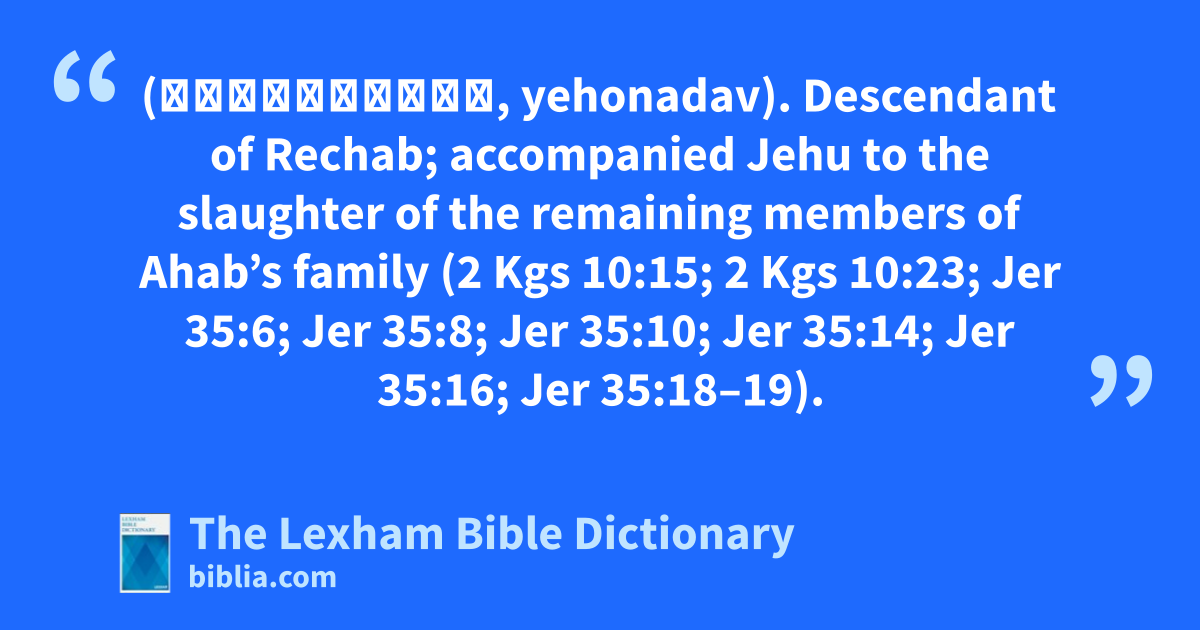 Jonadab, Son of Rechab (יְהוֹנָדָב, yehonadav). Descendant of Rechab; accompanied Jehu to the slaughter of the remaining members of Ahab’s family (2 Kgs 10:15; 2 Kgs 10:23; Jer 35:6; Jer 35:8; Jer 35:10; Jer 35:14; Jer 35:16; Jer 35:18–19).