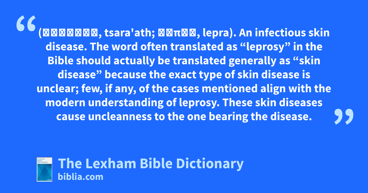 Leprosy (צָרַעַת, tsara'ath; λέπρα, lepra). An infectious skin disease. The word often translated as “leprosy” in the Bible should actually be translated generally as “skin disease” because the exact type of skin disease is unclear; few, if any, of the cases mentioned align with the modern understanding of leprosy. These skin diseases cause uncleanness to the one bearing the disease.