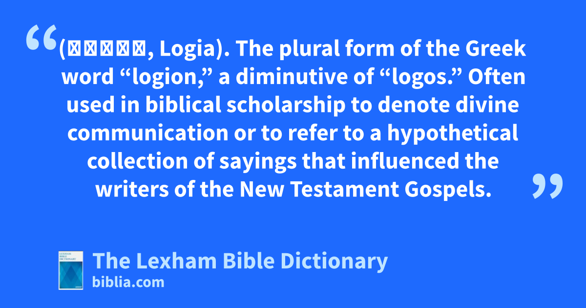 Logia (Λόγια, Logia). The plural form of the Greek word “logion,” a diminutive of “logos.” Often used in biblical scholarship to denote divine communication or to refer to a hypothetical collection of sayings that influenced the writers of the New Testament Gospels.