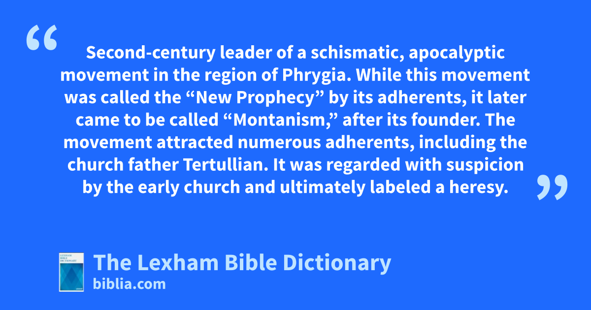 Montanus Second-century leader of a schismatic, apocalyptic movement in the region of Phrygia. While this movement was called the “New Prophecy” by its adherents, it later came to be called “Montanism,” after its founder. The movement attracted numerous adherents, including the church father Tertullian. It was regarded with suspicion by the early church and ultimately labeled a heresy.