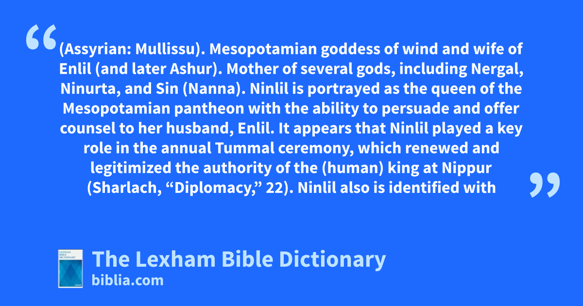 Ninlil (Assyrian: Mullissu). Mesopotamian goddess of wind and wife of Enlil (and later Ashur). Mother of several gods, including Nergal, Ninurta, and Sin (Nanna). Ninlil is portrayed as the queen of the Mesopotamian pantheon with the ability to persuade and offer counsel to her husband, Enlil.