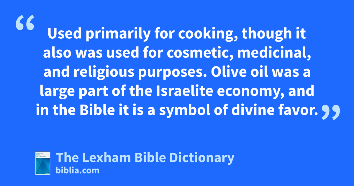 Olive Oil Used primarily for cooking, though it also was used for cosmetic, medicinal, and religious purposes. Olive oil was a large part of the Israelite economy, and in the Bible it is a symbol of divine favor.