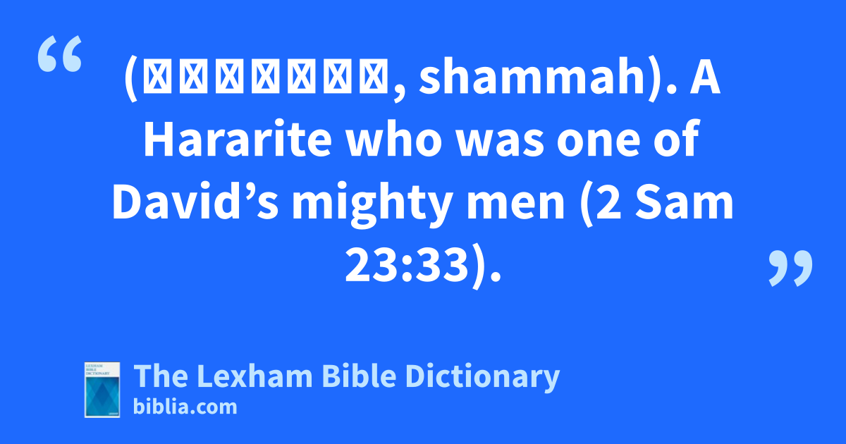 Shammah the Warrior (שַׁמָּה, shammah). A Hararite who was one of David’s mighty men (2 Sam 23:33).