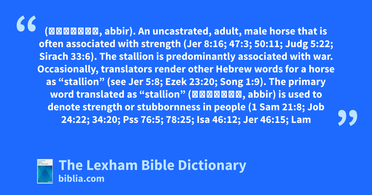 Stallion (אַבִּיר, abbir). An uncastrated, adult, male horse that is often associated with strength (Jer 8:16; 47:3; 50:11; Judg 5:22; Sirach 33:6). The stallion is predominantly associated with war. Occasionally, translators render other Hebrew words for a horse as “stallion” (see Jer 5:8; Ezek 23:20; Song 1:9). The primary word translated as “stallion” (אַבִּיר, abbir) is used to denote strength or stubbornness in people (1 Sam 21:8; Job 24:22; 34:20; Pss 76:5; 78:25; Isa 46:12; Jer 46:15; Lam 1:15). The word אַבִּיר (abbir) can also refer to bulls (Pss 22:12; 50:13; 68:30; Isa 34:7; Jer 50:11) and to angels (Psa 78:25).