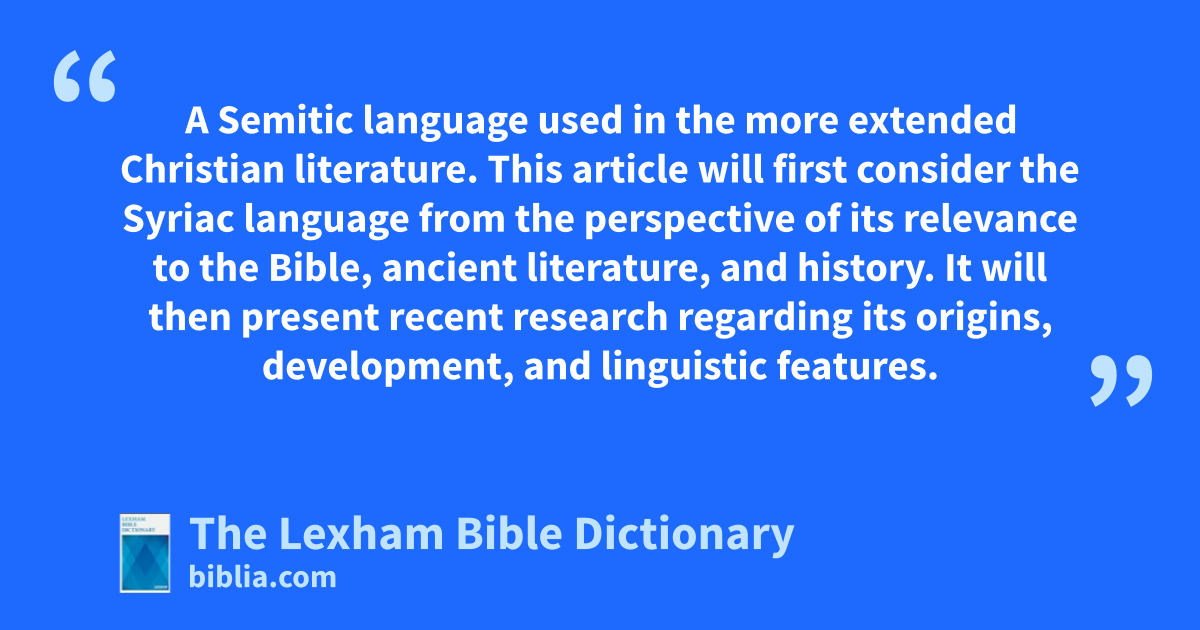 This article will first consider the Syriac language from the perspective of its relevance to the Bible, ancient literature, and history. It will then present recent research regarding its origins, development, and linguistic features.