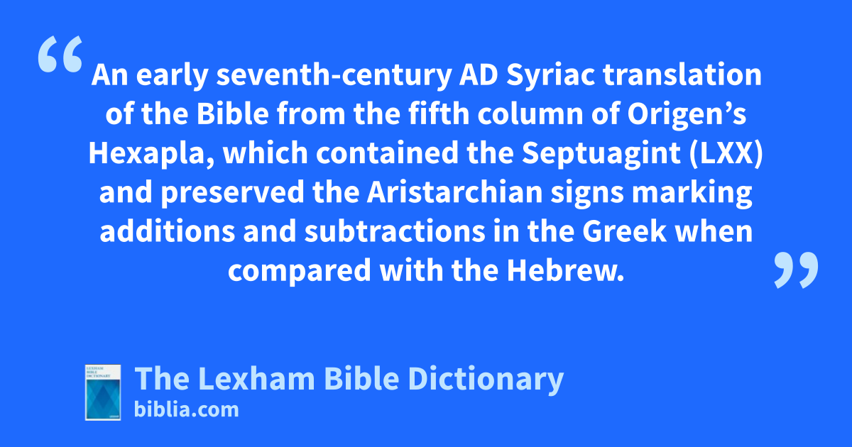Syro-Hexapla An early seventh-century ad Syriac translation of the Bible from the fifth column of Origen’s Hexapla, which contained the Septuagint (LXX) and preserved the Aristarchian signs marking additions and subtractions in the Greek when compared with the Hebrew.
