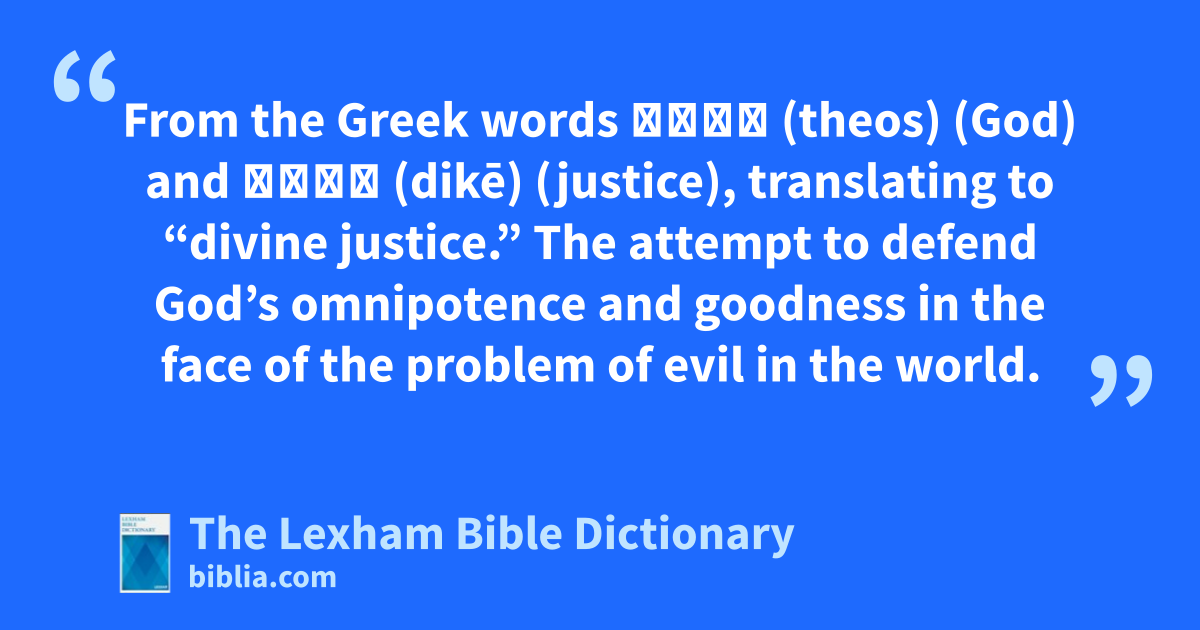 Theodicy From the Greek words θεός (theos) (God) and δίκη (dikē) (justice), translating to “divine justice.” The attempt to defend God’s omnipotence and goodness in the face of the problem of evil in the world.