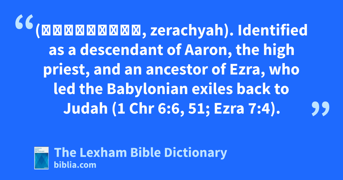 Zerahiah, Son of Uzzi (זְרַחְיָה, zerachyah). Identified as a descendant of Aaron, the high priest, and an ancestor of Ezra, who led the Babylonian exiles back to Judah (1 Chr 6:6, 51; Ezra 7:4).