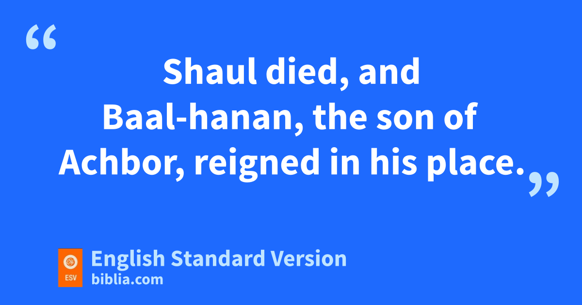 43 qThese are the kings who reigned in the land of Edom before any king reigned over the people of Israel: Bela the son of Beor, the name of his city being Dinhabah. 44 Bela died, and Jobab the son of Zerah of rBozrah reigned in his place. 45 Jobab died, and Husham of the land of the sTemanites reigned in his place. 46 Husham died, and Hadad the son of Bedad, who defeated Midian in the country of Moab, reigned in his place, the name of his city being Avith. 47 Hadad died, and Samlah of Masrekah reigned in his place. 48 Samlah died, and Shaul of Rehoboth on the Euphrates14 reigned in his place. 49 Shaul died, and Baal-hanan, the son of Achbor, reigned in his place. 50 Baal-hanan died, and Hadad reigned in his place, the name of his city being Pai; and his wife’s name was Mehetabel, the daughter of Matred, the daughter of Mezahab. 51 And Hadad died.
