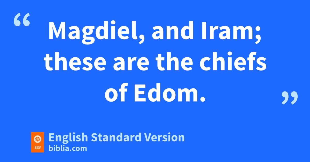 The chiefs of Edom were: chiefs Timna, Alvah, Jetheth, 52 Oholibamah, Elah, Pinon, 53 Kenaz, Teman, Mibzar, 54 Magdiel, and Iram; these are the chiefs of Edom.