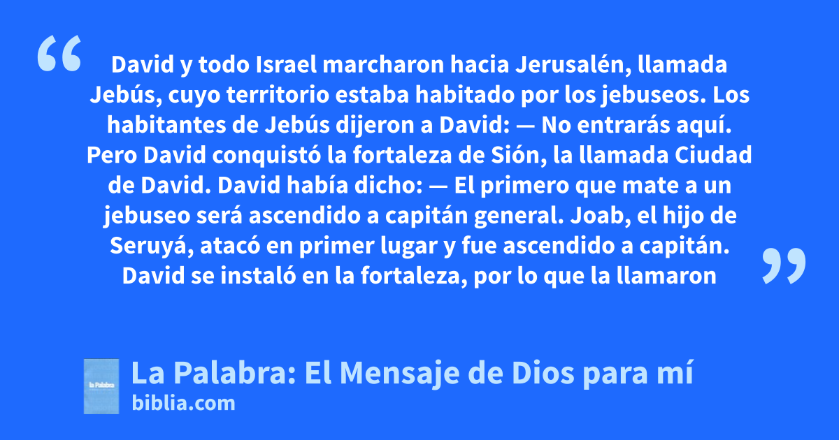 Joab, el hijo de Seruyá, atacó en primer lugar y fue ascendido a capitán. 7 David se instaló en la fortaleza, por lo que la llamaron Ciudad de David. 8 Luego edificó la ciudad de alrededor, desde el terraplén hasta la muralla, mientras Joab restauraba el resto de la ciudad. 9 David iba haciéndose cada día más poderoso, pues el Señor del universo estaba con él.