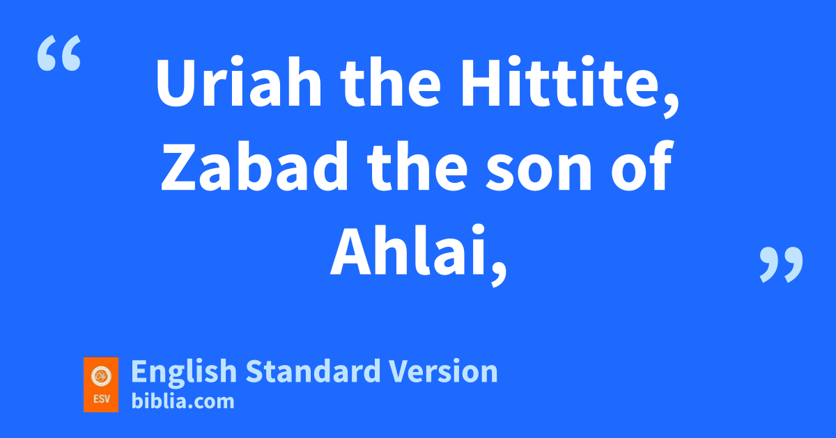 26 The mighty men were uAsahel the brother of Joab, Elhanan the son of Dodo of Bethlehem, 27 Shammoth of Harod,8 Helez the Pelonite, 28 Ira the son of Ikkesh of Tekoa, Abiezer of Anathoth, 29 Sibbecai the Hushathite, Ilai the Ahohite, 30 Maharai of Netophah, Heled the son of Baanah of Netophah, 31 Ithai the son of Ribai of Gibeah of the people of Benjamin, Benaiah of Pirathon, 32 Hurai of the brooks of Gaash, Abiel the Arbathite, 33 Azmaveth of Baharum, Eliahba the Shaalbonite, 34 Hashem9 the Gizonite, Jonathan the son of Shagee the Hararite, 35 Ahiam the son of Sachar the Hararite, Eliphal the son of Ur, 36 Hepher the Mecherathite, Ahijah the Pelonite, 37 Hezro of Carmel, Naarai the son of Ezbai, 38 Joel the brother of Nathan, Mibhar the son of vHagri, 39 Zelek the Ammonite, Naharai of Beeroth, the armor-bearer of Joab the son of Zeruiah, 40 Ira the Ithrite, Gareb the Ithrite, 41 Uriah the Hittite, wZabad the son of Ahlai, 42 Adina the son of Shiza the Reubenite, a leader of the Reubenites, and thirty with him, 43 Hanan the son of Maacah, and Joshaphat the Mithnite, 44 Uzzia the Ashterathite, Shama and Jeiel the sons of Hotham the Aroerite, 45 Jediael the son of Shimri, and Joha his brother, the Tizite, 46 Eliel the Mahavite, and Jeribai, and Joshaviah, the sons of Elnaam, and Ithmah the Moabite, 47 Eliel, and Obed, and Jaasiel the Mezobaite.