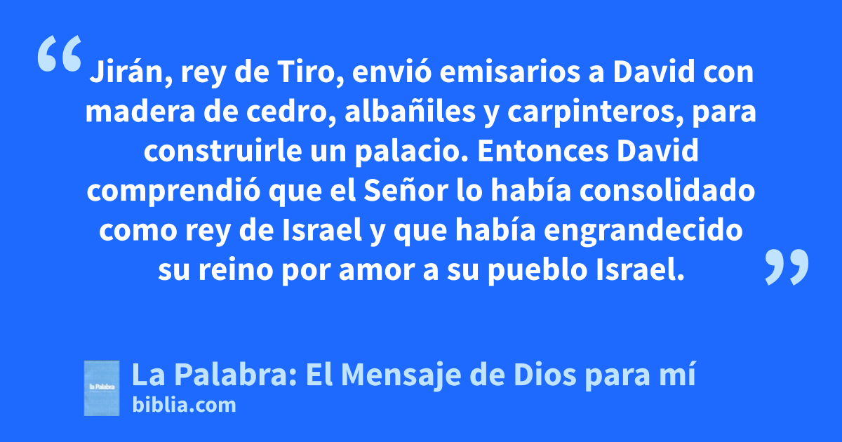14 Jirán, rey de Tiro, envió emisarios a David con madera de cedro, albañiles y carpinteros, para construirle un palacio. 2 Entonces David comprendió que el Señor lo había consolidado como rey de Israel y que había engrandecido su reino por amor a su pueblo Israel.