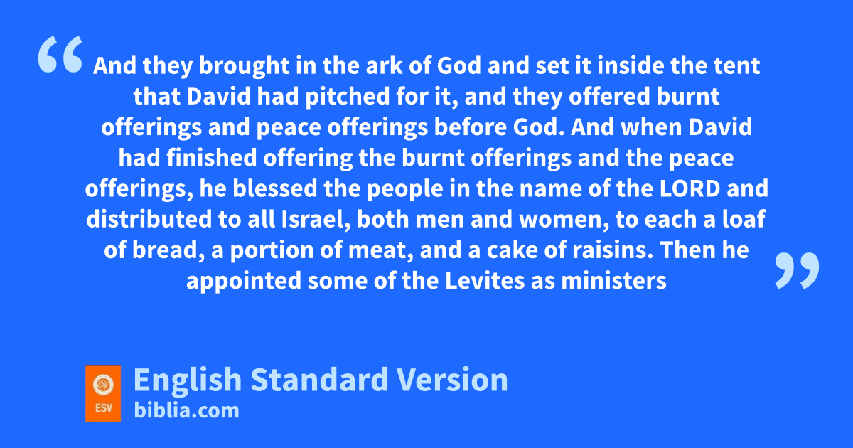 16 And they brought in the ark of God and set it inside cthe tent that David had pitched for it, and they offered burnt offerings and peace offerings before God. 2 And when David had finished offering the burnt offerings and the peace offerings, he blessed the people in the name of the Lord 3 and distributed to all Israel, both men and women, to each a loaf of bread, a portion of meat,1 and a cake of raisins.