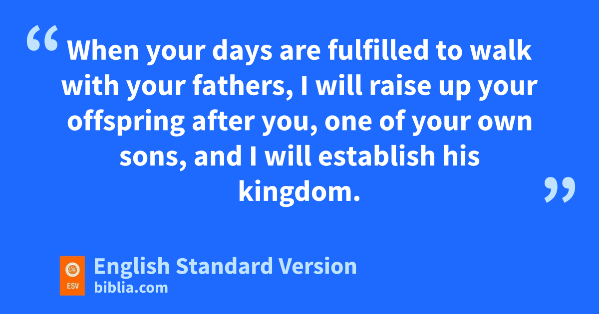 3 But that same night the word of the Lord came to Nathan, 4 “Go and tell my servant David, ‘Thus says the Lord: uIt is not you who will build me a house to dwell in. 5 For I have not lived in a house since the day I brought up Israel to this day, vbut I have gone from tent to tent and from dwelling to dwelling. 6 In all places where I have moved with all Israel, did I speak a word with any of the judges of Israel, whom I commanded to shepherd my people, saying, “Why have you not built me a house of cedar?” ’ 7 Now, therefore, thus shall you say to my servant David, ‘Thus says the Lord of hosts, I took you from the pasture, from following the sheep, to be prince over my people Israel, 8 and I have been with you wherever you have gone and have cut off all your enemies from before you. And I will make for you a name, like the name of the great ones of the earth. 9 And I will appoint a place for my people Israel and will plant them, that they may dwell in their own place and be disturbed no more. And violent men shall waste them no more, as formerly, 10 from the time that I appointed judges over my people Israel. And I wwill subdue all your enemies. Moreover, I declare to you that the Lord will build you a house. 11 When your days are fulfilled to walk with your fathers, I will raise up your offspring after you, one of your own sons, and I will establish his kingdom. 12 He shall build a house for me, and I will establish his throne forever. 13 xI will be to him a father, and he shall be to me a son. I will not take my steadfast love from him, yas I took it from him who was before you, 14 but I will confirm him in my house and in my kingdom forever, and his throne shall be established forever.’ ” 15 In accordance with all these words, and in accordance with all this vision, Nathan spoke to David.
