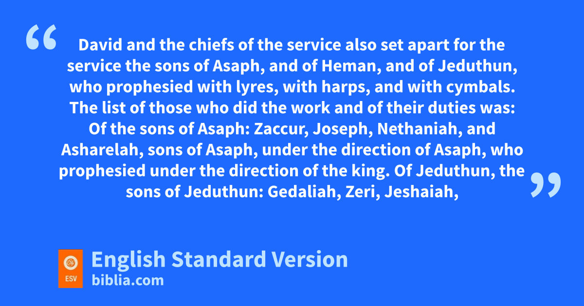 25 David and the chiefs of the service also set apart for the service the sons of yAsaph, and of zHeman, and of aJeduthun, who bprophesied with lyres, with charps, and with cymbals. The list of those who did the work and of their duties was: 2 Of the sons of Asaph: Zaccur, Joseph, Nethaniah, and Asharelah, sons of Asaph, under the direction of Asaph, who bprophesied under the direction of the king. 3 Of Jeduthun, the sons of Jeduthun: Gedaliah, Zeri, Jeshaiah, Shimei,1 Hashabiah, and Mattithiah, six, under the direction of their father Jeduthun, bwho prophesied with the lyre in thanksgiving and praise to the Lord. 4 Of Heman, the sons of Heman: Bukkiah, Mattaniah, Uzziel, Shebuel and Jerimoth, Hananiah, Hanani, Eliathah, Giddalti, and Romamti-ezer, Joshbekashah, Mallothi, Hothir, Mahazioth. 5 All these were the sons of Heman dthe king’s seer, according to the promise of God to exalt him, for God had given Heman fourteen sons and three daughters. 6 They were all under the direction of their father in the music in the house of the Lord with cymbals, charps, and lyres for the service of the house of God. Asaph, Jeduthun, and Heman were under the order of the king. 7 The number of them along with their brothers, who were trained in singing to the Lord, all who were skillful, was e288. 8 And they cast lots for their duties, fsmall and great, teacher and pupil alike.